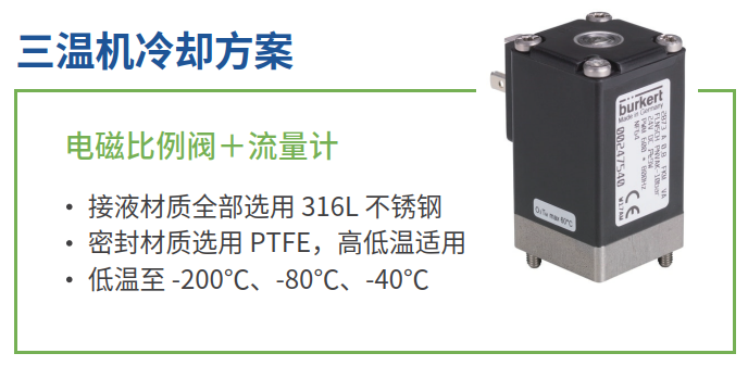 通過2組Burkert電動閥的控制 Chiller 的高低溫氟化液匯流循環,以實現機臺的無極調溫目的。